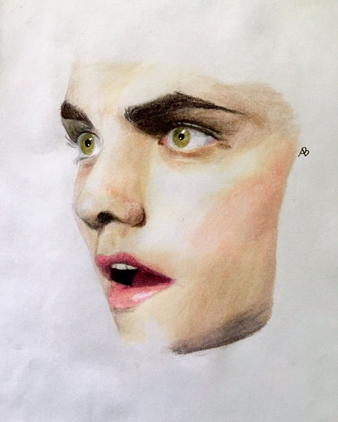 Freehand drawing with color pencils on paper, using image reference